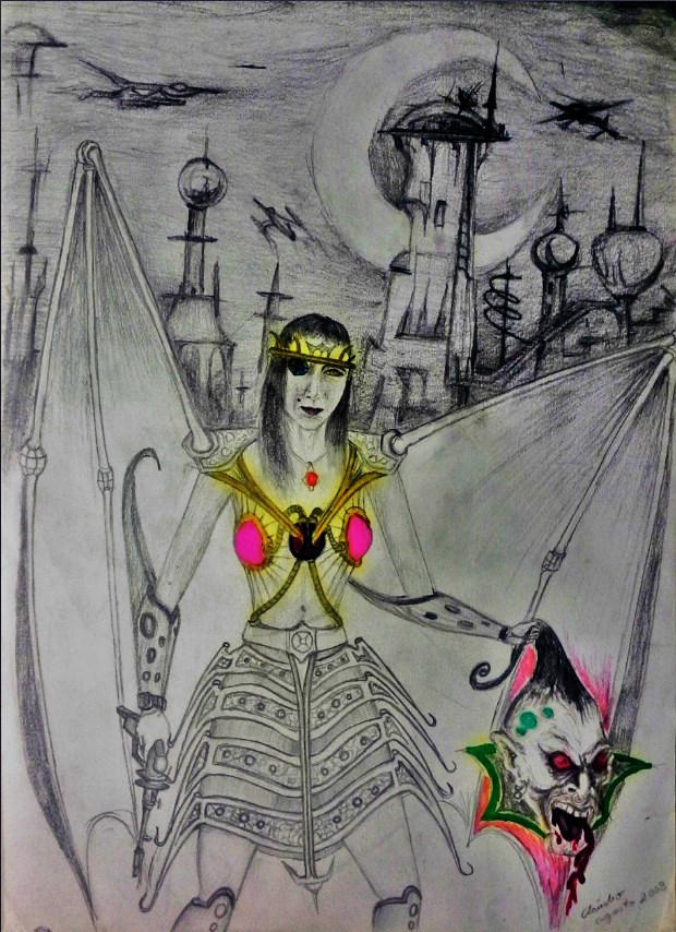Este desenho que tirei do meu baú foi feito a lápis grafite e teve algumas partes pintadas com caneta hidrográfica. A cena da mulher figura um cenário que é futurista mas também bárbaro. Espero que tenham gostado, se quiserem deixem seus comentário e, Até a Próximo.